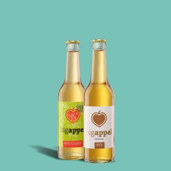 angereichert mit prickelnder kohlensäure: bigappel pur sowie als schorle in der praktischen 0,33 l longneck-mehrwegflasche.
